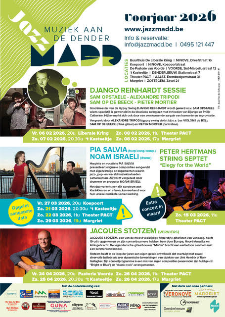 9 februari 2026Jazz-Madd Muziek aan de Dender Zaterdaag, 21 maart 2026, 20.30u 't Kasteeltje, Denderleeuw Zondag, 22 maart 2026, 11u Foyer Theater…