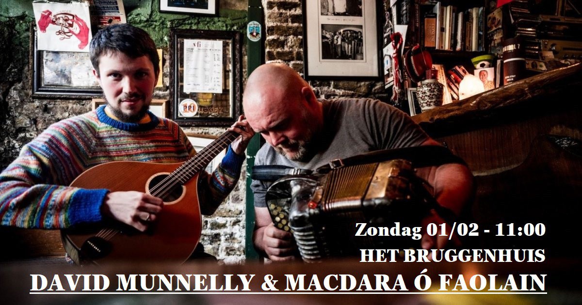 De jaarlijkse komst van de Ierse accordeonist David Munnelly (The Chieftains, The Dannan) begint een beetje traditie te worden in ‘t Bruggenhuis. Er zijn veel goede diatonische accordeonisten, maar er is toch maar één David Munnelly. Naar gewoonte mengt hij op virtuoze wijze de Ierse traditie met jazz, klassiek en folk van overal. Deze keer brengt hij de jonge Ierse violist, gitarist en zanger Macdara Ó Faoláin mee. Macdara werd in Ierland uitgeroepen tot folkmuzikant van het jaar en voegt ook zijn eigen composities toe. Wij kijken er zeker naar uit en vanzelfsprekend zal de Guinness op deze morgen schuimen!