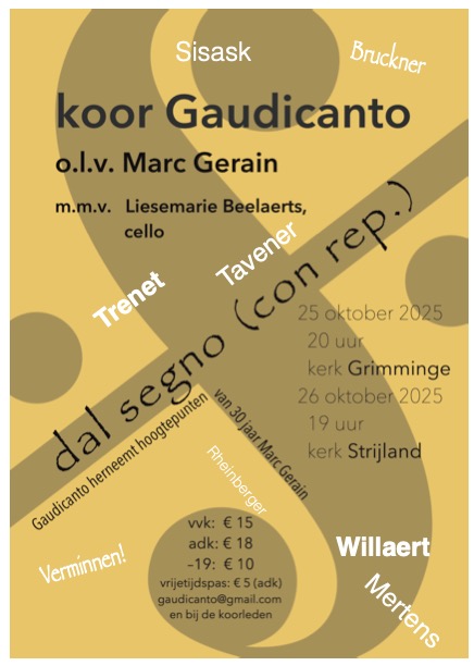 Met de concerten van zaterdag 25 oktober in de kerk van Grimminge om 20 uur en van zondag 26 oktober 2025 in de kerk van Strijland (Gooik) om 19 uur, blikt Gaudicanto terug op het omvangrijk en gevarieerd repertorium dat tot stand kwam onder de kundige en bezielende leiding van Marc Gerain.