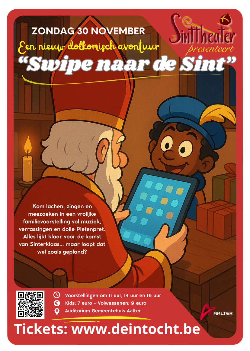 Op zondag 30 november 2025 nodigen wij jullie van harte uit in het gezelligste theaterzaaltje in Aalter voor een gloednieuwe theatervoorstelling van het Sinttheater… vol humor, muziek, spanning én een vleugje magie.