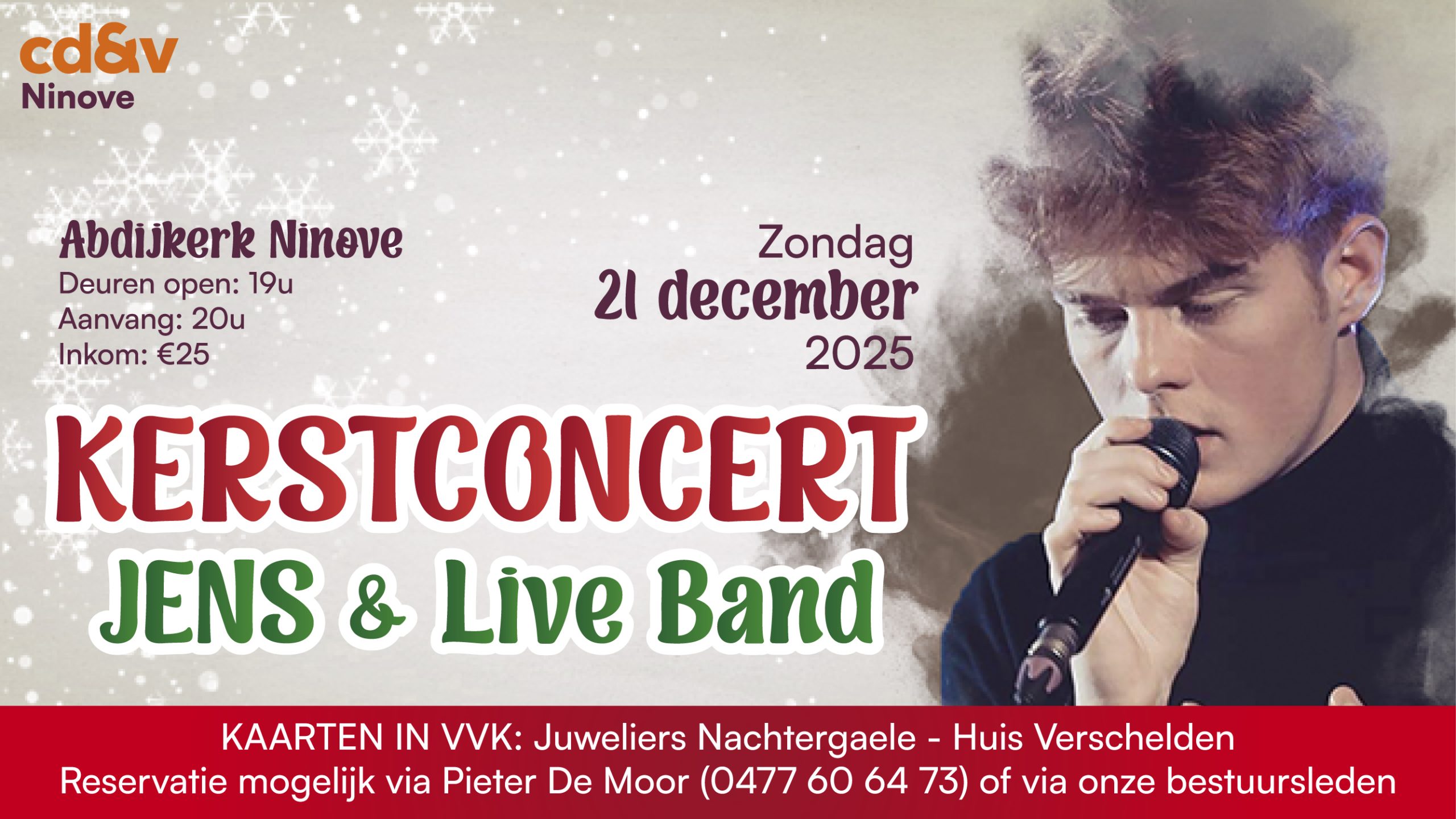Op zondag 21 december 2025 organiseert cd&v Ninove opnieuw haar jaarlijkse kerstconcert, dit jaar met Jens & Live Band als hoofdact. De sfeervolle Abdijkerk vormt opnieuw het decor voor een muzikale avond die traditiegetrouw heel wat Ninovieters samenbrengt tijdens de eindejaarsperiode.