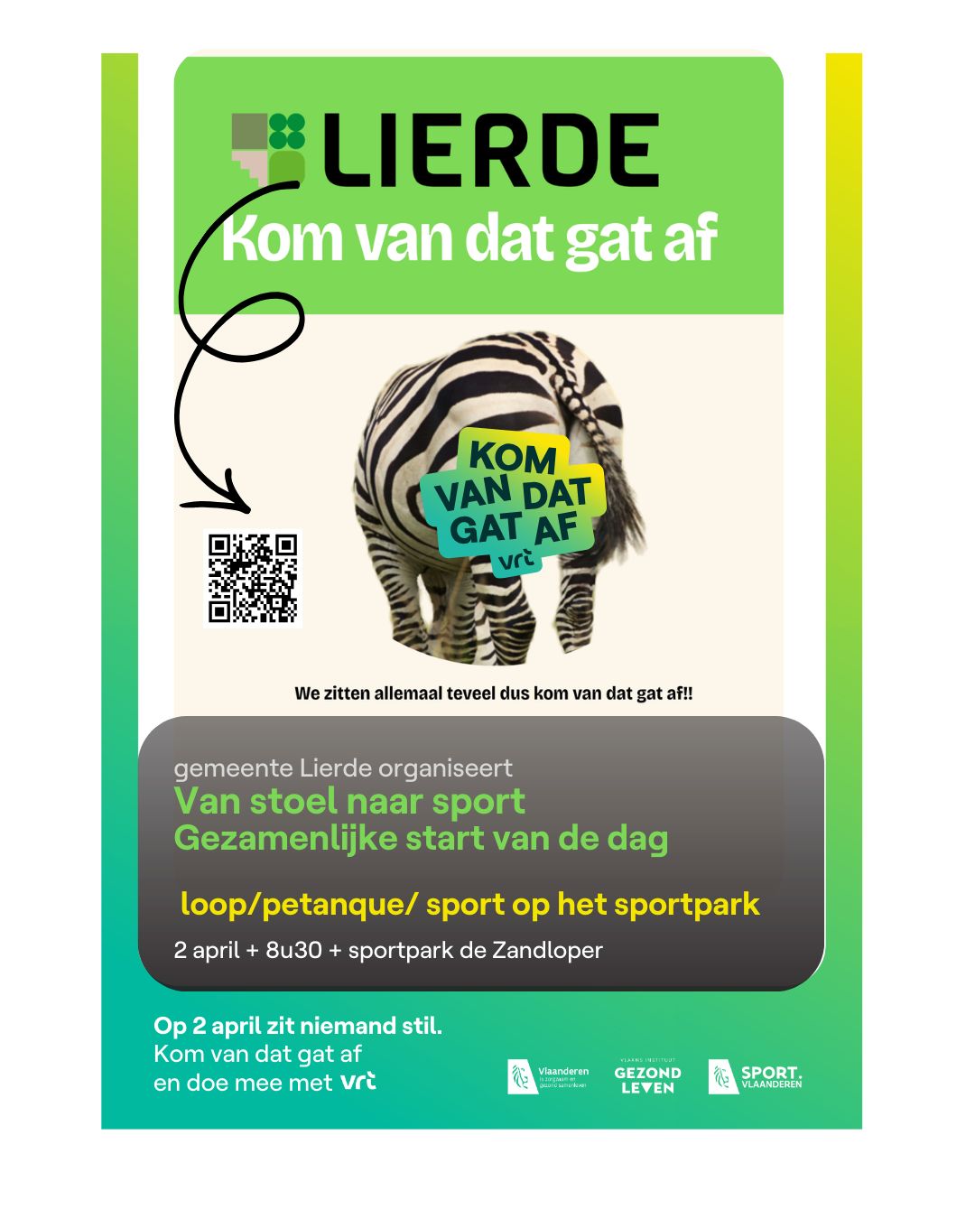 Vlamingen zitten te veel. We brengen gemiddeld meer dan acht uur per dag zittend door. Bovendien beweegt 4 op de 5 jongeren te weinig en is 1 op de 2 Vlamingen niet tevreden over zijn fysieke gezondheid. Daarom lanceert de VRT de actie ‘Kom van dat gat af’, met één duidelijke oproep: op 2 april zit niemand stil. Ook de gemeente Lierde doet mee aan deze nationale actiedag en roept inwoners, scholen, ondernemers en medewerkers op om letterlijk van dat gat af te komen en te tonen hoe zij in beweging komen. Op donderdag 2 april om 8u30 organiseert de gemeente een gezamenlijk beweegmoment op Sportpark De Zandloper. Tijdens dit moment komt iedereen samen om de dag actief te starten en symbolisch van zijn stoel te komen. “Met deze actie willen we onze inwoners aanmoedigen om meer te bewegen in het dagelijkse leven. Dat hoeft niet altijd intensief of sportief te zijn. Ook kleine momenten van beweging maken een groot verschil voor onze gezondheid,” zegt Schepen van gezondheid Katelijne Scheirlinckx. Ook schepen van Sport Antoine Van de Maele benadrukt het belang van laagdrempelige beweging: “Met dit beweegmoment willen we tonen dat bewegen voor iedereen haalbaar is. Door samen in beweging te komen hopen we inwoners te inspireren om ook nadien vaker te kiezen voor een actieve levensstijl.” Naast het gezamenlijke beweegmoment roept de gemeente inwoners op om zelf ook deel te nemen aan de actie. Dit kan door een korte beweegvideo te delen via sociale media met de hashtags #KomVanJeGatAf en #Lierde. De actie wordt georganiseerd door VRT in samenwerking met Sport Vlaanderen, Gezond Leven en het Departement Zorg.