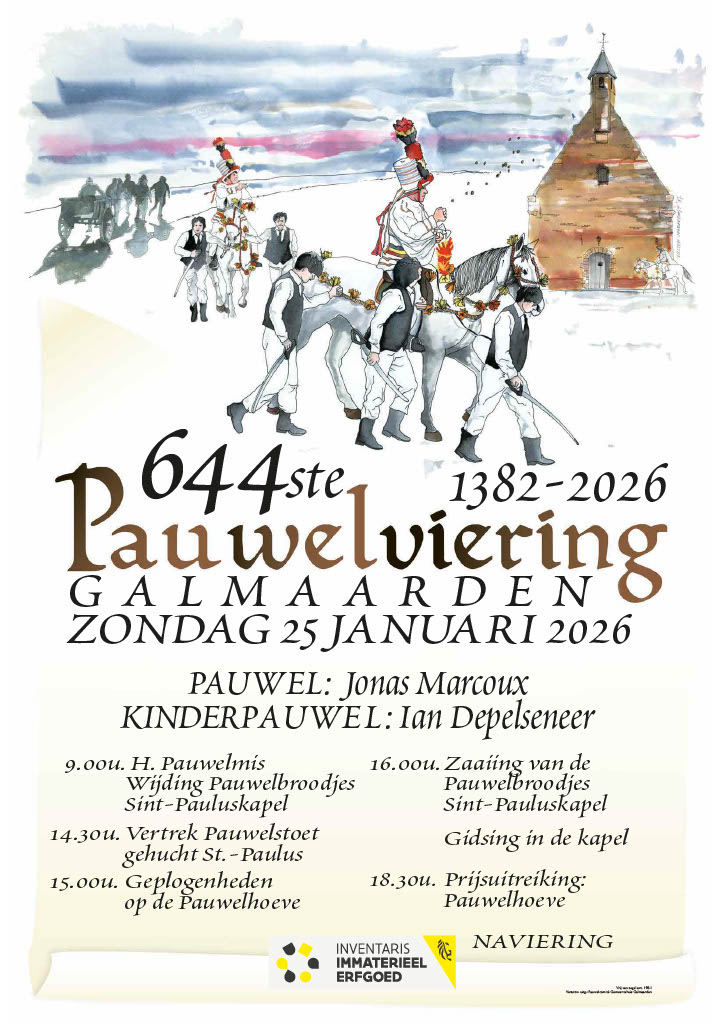 Zondag 25 januari 2026 van 14:00 tot 20:00 Sint-Pauluskapel Sint-Paulusstraat, 1570 Galmaarden De Pauwelviering is een authentiek folkloristisch feest in Galmaarden (Vlaams-Brabant) dat reeds sinds eeuwen vergroeid is met het dorp (en meer bepaald met het gehucht Sint-Paulus). De feestelijkheden geschieden op de eerste zondag volgend op 25 januari of op de dag zelf indien dit een zondag is. Op 7 juli 2016 werd de Pauwelviering door Vlaanderen erkend als immaterieel cultureel erfgoed. Onder meer aan de Pauwelhoeve en de Sint-Pauluskapel gaan de feestelijkheden door.