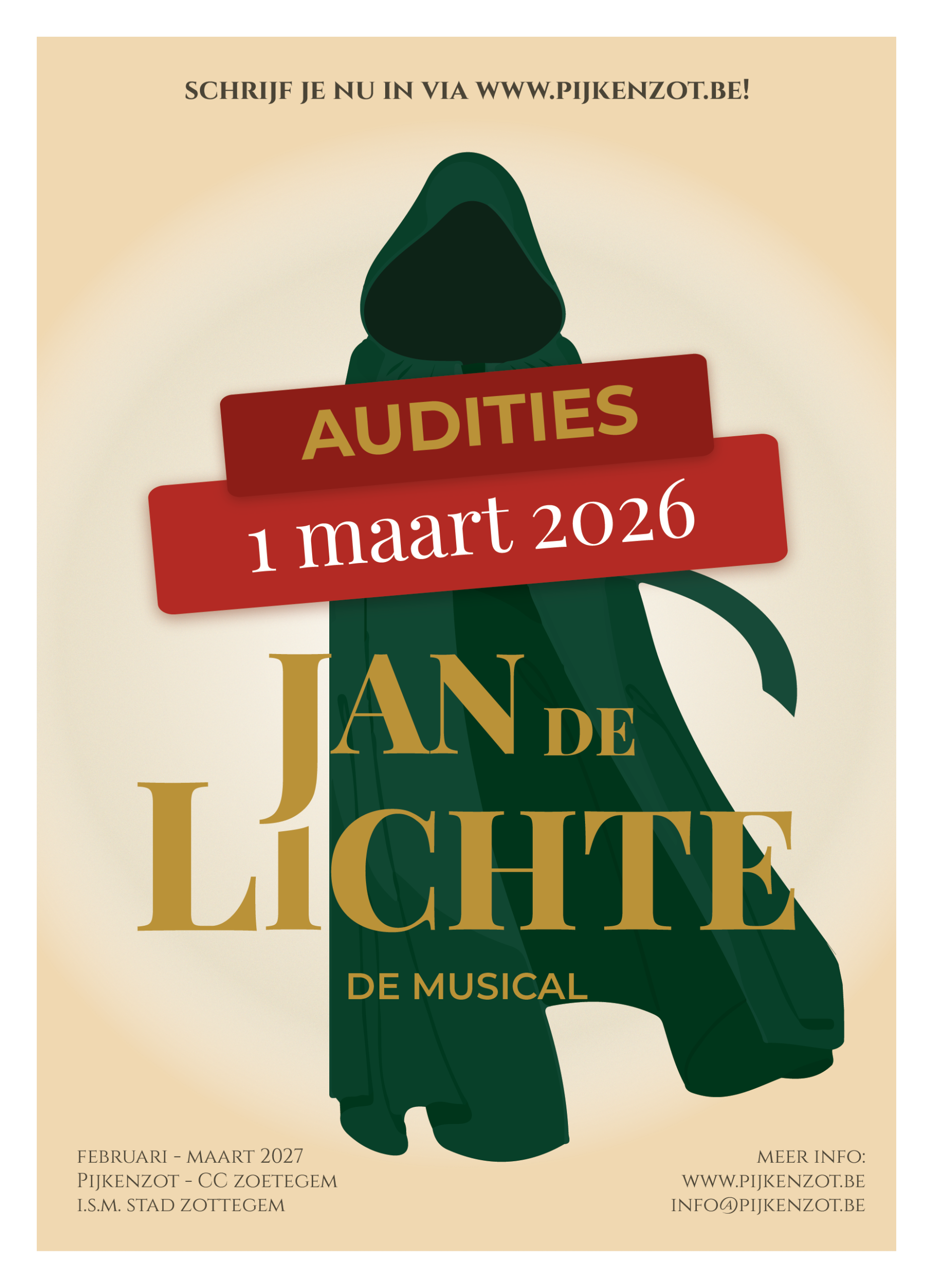 Na een pauze staat vzw Pijkenzot opnieuw klaar voor een volgend groots nieuw musicalproject. De Zottegemse vzw die bestaat uit Zottegemnaren Elke Moreels, Lien Wattez en Maarten Vansintjan zijn bekend van de musicals Egmont en Allemaal Flandrien. Met veel plezier kondigen zij Jan De Lichte – de musical aan! Een originele productie die in februari en maart 2027 te zien zal zijn in CC Zoetegem, met de steun van Stad Zottegem en CC Zoetegem. Maar eerst en vooral is Pijkenzot op zoek naar spelers. Op 1 maart 2026 organiseren ze daarom in de Ridderzaal van het Kasteel van Egmont een open auditie, waar iedereen vanaf 11 jaar welkom is, ongeacht ervaring. Omdat het scenario en de muziek speciaal voor deze musical worden geschreven, is er ruimte voor uiteenlopende rollen en profielen. Jong of ouder, zingend, acterend of bewegend talent: iedereen krijgt een eerlijke kans. Uiteraard voorzien ze in professionele zang- en acteerlessen tijdens het volledige repetitieproces. Zoals bij eerdere producties werkt Pijkenzot terug samen met een professionele componist, scenarist, regisseur en costumier. De musical wordt volledig in eigen beheer geproduceerd, met veel aandacht voor kwaliteit, begeleiding en samenwerking tussen lokaal talent en ervaren professionnels. Naast spelers zoekt Pijkenzot ook andere creatievelingen en helpende handen, zoals mensen voor grime, podiumbouw, rekwisieten en praktische ondersteuning. Wie liever achter de schermen meewerkt, is dus even welkom. Tot slot doet de vzw ook een oproep naar sponsors die hun naam willen verbinden aan dit bovenlokale cultuurproject. Met tien voorstellingen en een verwacht bereik van zo’n 3.000 bezoekers, biedt Pijkenzot interessante visibiliteit en een aantrekkelijk sponsorpakket. Alle praktische informatie over de audities, het inschrijvingsformulier en de musical is te vinden op www.pijkenzot.be of via info@pijkenzot.be.