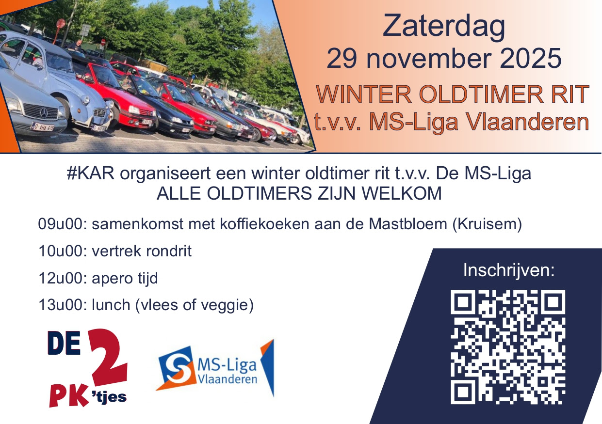 Op zaterdag 29 november organiseren de Kruisemse Avond Rijders (#KAR) een gezellige rondrit (+/_ 60km) ten voordele van de MS-Liga Vlaanderen.