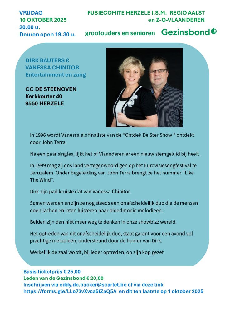 23 juli 2025Entertainment & zang vr 10 oktober 2025 van 20 tot 21.45 uur De Steenoven Kerkkouter 40 9550 HERZELE € 25,00 / € 20 |…