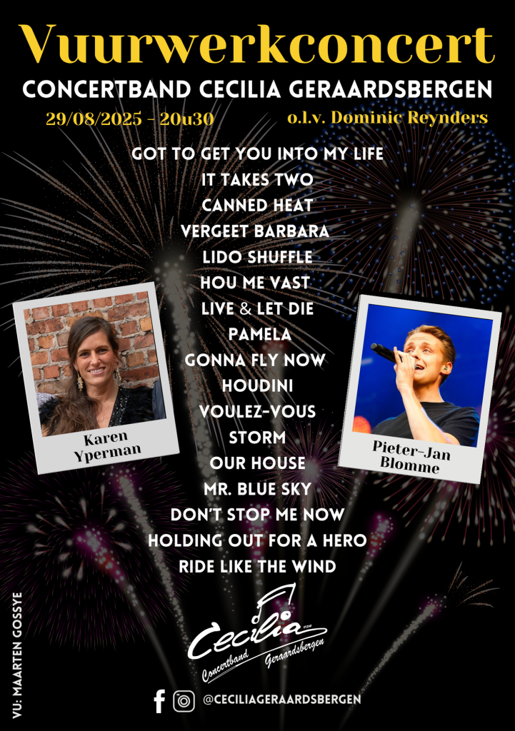 22 juli 2025Geraardsbergse Zomerkermis Concertband Cecilia vrijdag 29 augustus - 20:30 Markt Geraardsbergen Zie flyer