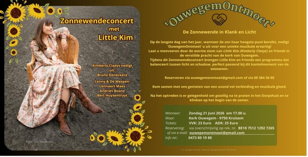 24 maart 2026Little Kim en Lenny en de Wespenop zondag 21 juni 2026 om 17.00 u. in de kerk van OuwegemOuwegemsesteenweg 147 Zingem (Kruisem)Kaarten: 23 Euro VVK door overschrijving…