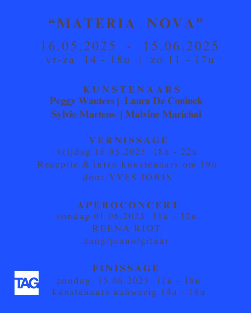 27 april 2025EXPO MATERIA NOVA 16/05/2025 – 15/06/2025 Friday – Saturday 14:00–18:00 Sunday 11:00–17:00 Artists Peggy Wauters - Laura de Coninck - Sylvie Martens - Malvine…
