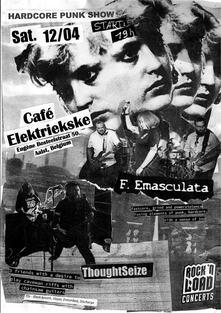 17 februari 2025Saturday - 12 April, 2025 - 19:00 't Elektriekske Eugeen Bosteelsstraat 50 9300 Aalst Free donation bar show! F.EMASCULATA X-Files fuelled hc/punk…