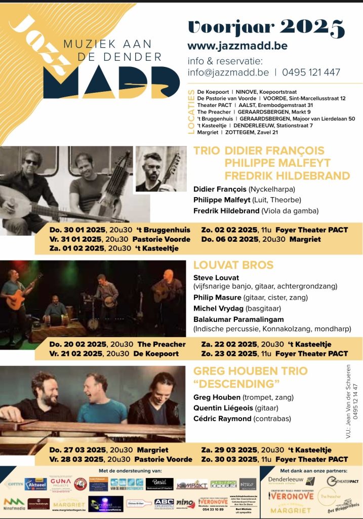 18 januari 2025GREG HOUBEN TRIO "DESCENING" Donderdag, 27 maart 2025, 20.30u Margriet, Zavel 21 Zottegem Vrijdag, 28 maart 2025, 20.30u Pastorie, Sint-Marcellusstraat…