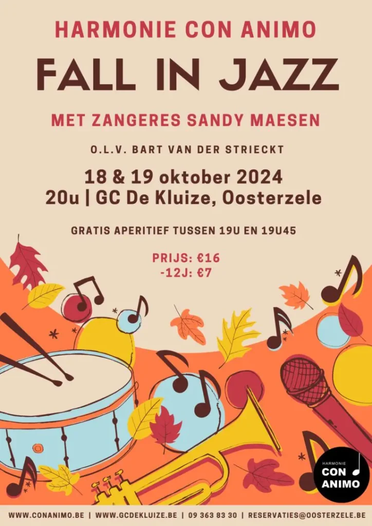7 september 2024Fall in Jazz vrijdag 18 oktober 2024 om 20:00 zaterdag 19 oktober 2024 om 20:00 theaterzaal De Kluize, Sportstraat 3,…