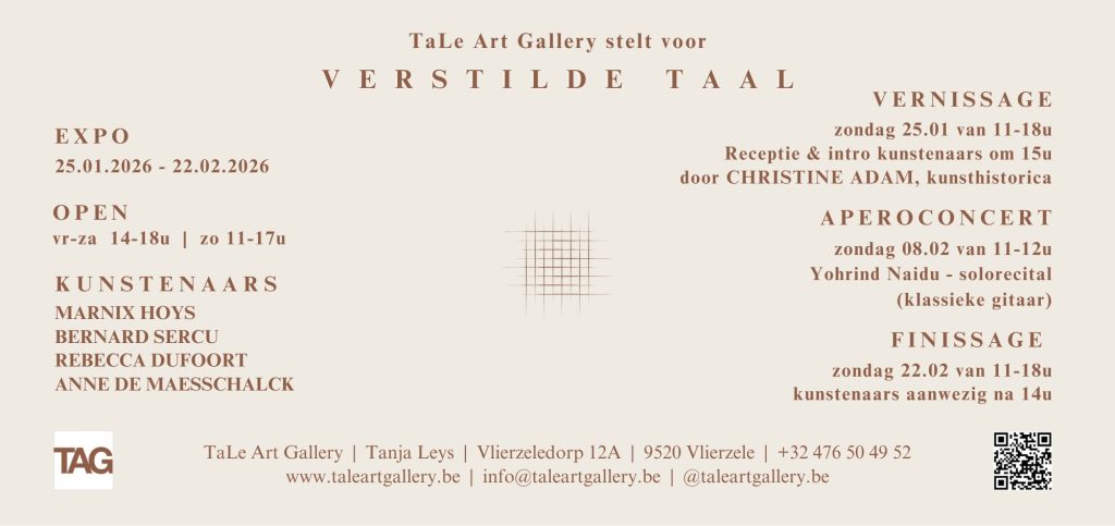 20 januari 2026Enthousiast… om u via deze weg persoonlijk uit te nodigen voor de vernissage van de expo “ VERSTILDE TAAL ” Vernissage…