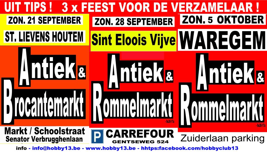 - Antiek- en Rommelmarkt20 september 2025Zondag 5 oktober 2025 WAREGEM Antiek & Rommelmarkt parking Zuiderpromenade! van 08:00 tot 17:00 Ontdek meer via www.hobby13.be