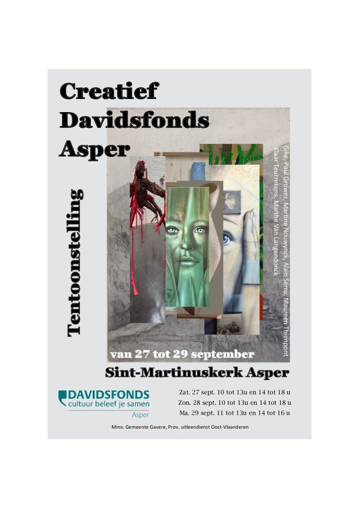- “Creatief Davidsfonds Asper”.17 september 2025TENTOONSTELLING van 27 tot 29 september 2025 Sint-Martinuskerk, Steenweg, Asper op zaterdag 27 september van 10u. tot 13u. en van…