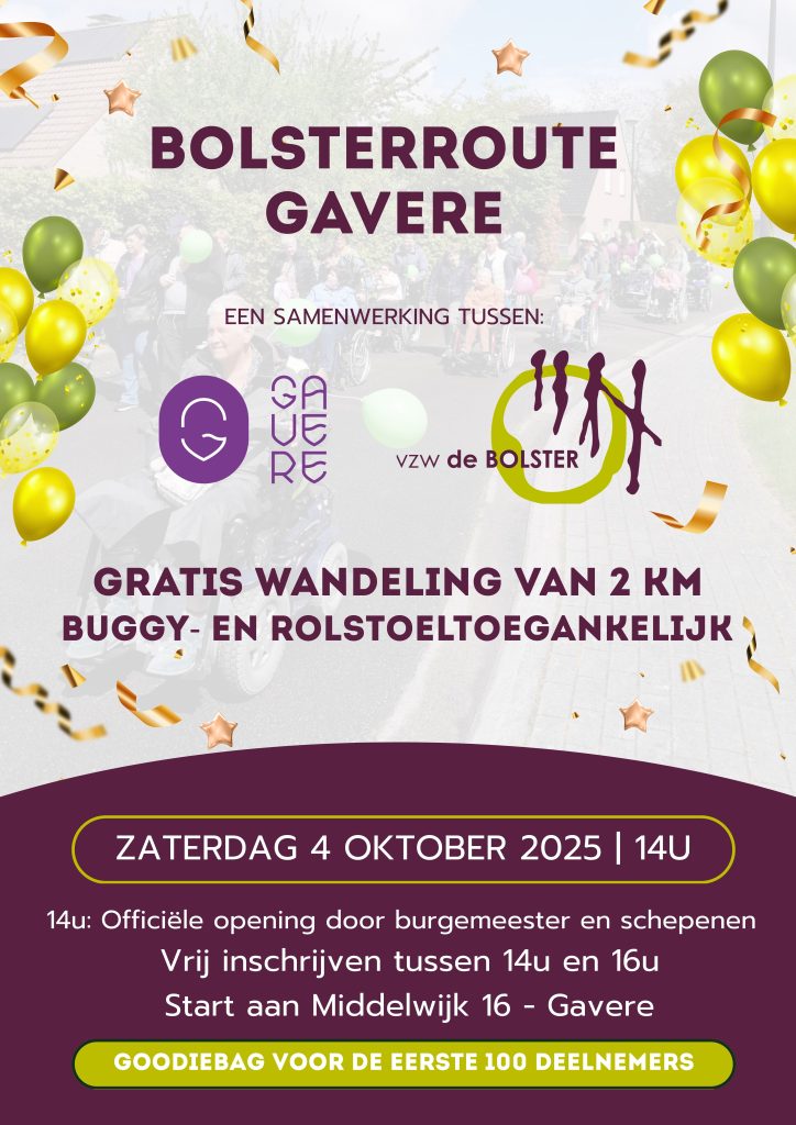 9 september 2025Op zaterdag 4 oktober 2025 wordt de Bolsterroute Gavere feestelijk geopend. Deze nieuwe wandelroute van 2 km is volledig buggy-…