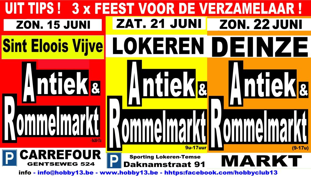 12 juni 2025Zaterdag 21 juni 2025 LOKEREN (9160) Antiek & Rommelmarkt van 09 tot 17 u parking voetbalclub Lokeren-Temse Daknamstraat 91 www.hobby13.be