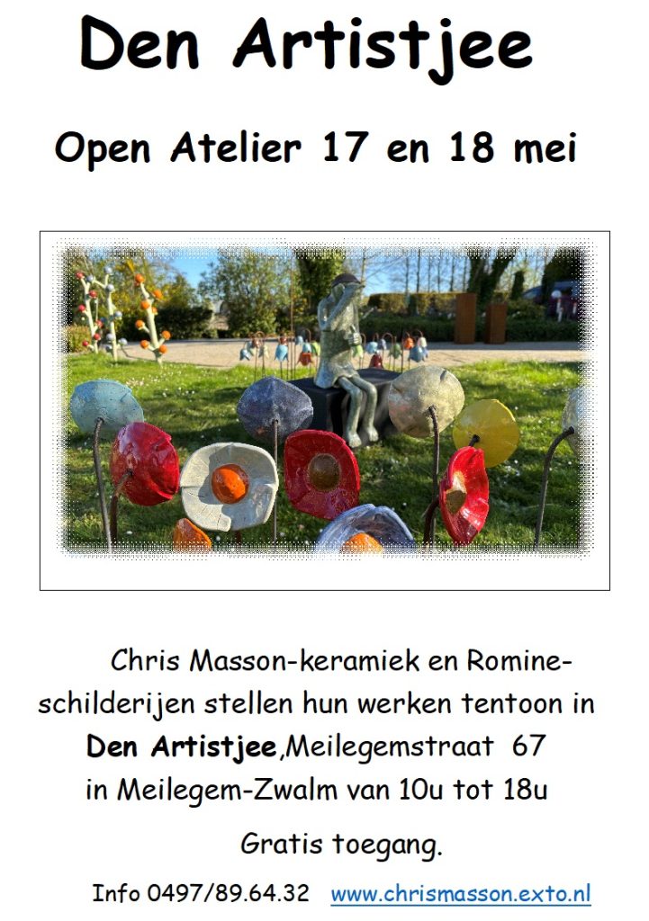26 april 2025Den Artistjee Open Atelier 17 en 18 mei Chris Masson-keramiek en Romine-schilderijen stellen hun werken tentoon in Den Artistjee,Meilegemstraat 67…