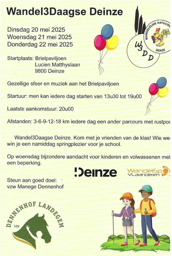 25 april 2025Op 20 - 21 en 22 mei 2025 De wandelingen starten zoals steeds in het Brielpaviljoen te Deinze Lucien Matthyslaan,…