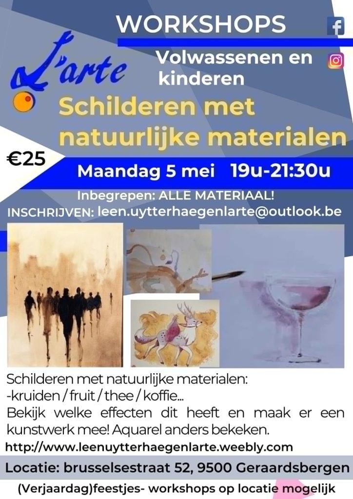 23 februari 2025Workshops L'Arte maandag 25 mei 19u - 21u30 Brusselsestraat 52 Geraardsbergen €25 inschrijven Leen.uytterhaegenlarte@outlook.be Kunst beleven is kijken naar dingen…