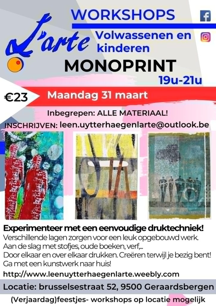 23 februari 2025Workshops L'Arte maandag 31 maart 19u - 21u Brusselsestraat 52 Geraardsbergen €23 inschrijven Leen.uytterhaegenlarte@outlook.be Kunst beleven is kijken naar dingen…