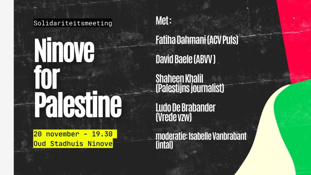12 november 2024Solidariteitsmeeting woensdag 20 november 19:30 Oud Stadhuis Oudstrijdersplein 6, 9400 Ninove Sprekers zijn: Shaheen Khalil (Palestijns journalist en politiek analist,…