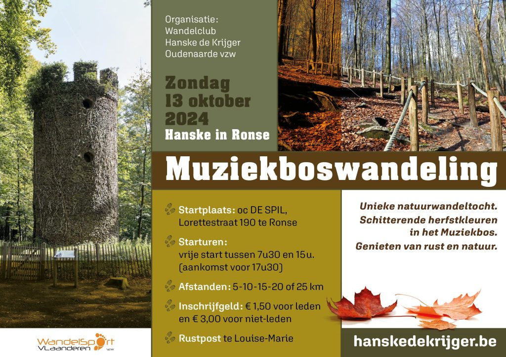 10 oktober 2024wandelclub Hanske de Krijger zondag 13 oktober startplaats oc De Spil Lorettestraat 190 te Ronse Afstanden 5 - 10 -…