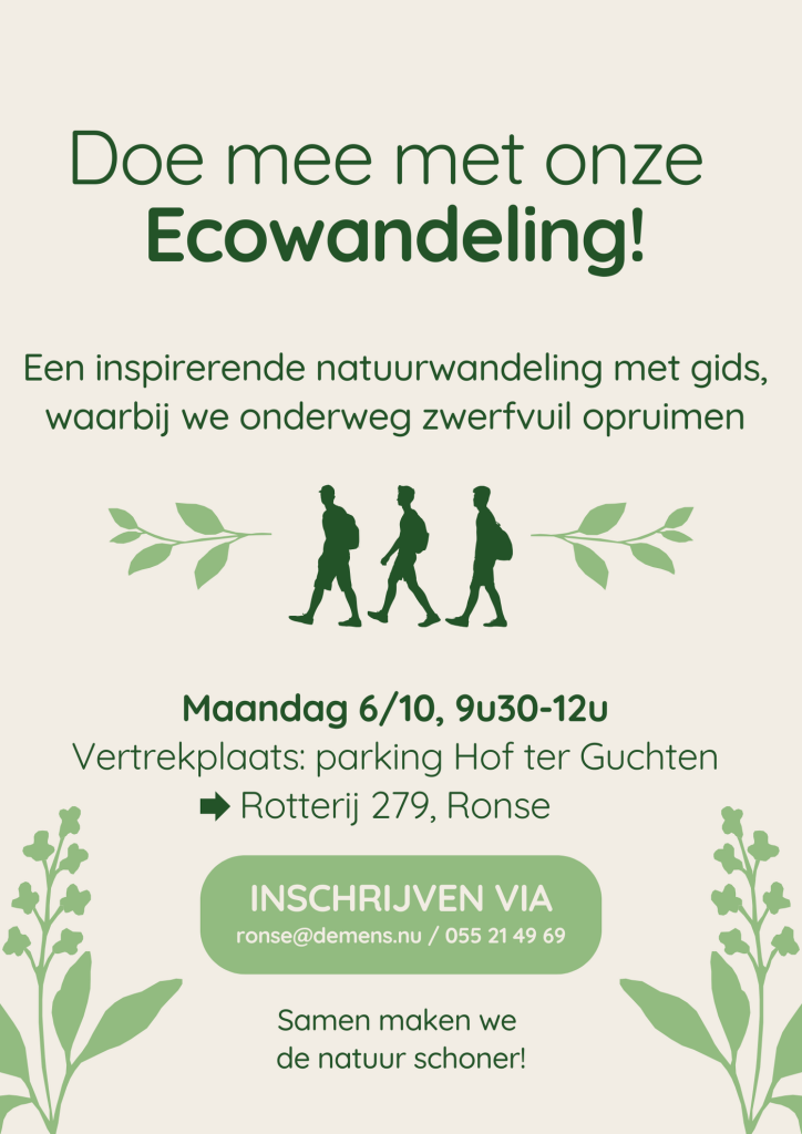 - Ecowandeling1 oktober 2025Ecowandeling Ma 6 oktober 9u30 - 12u00 Parking Hof ter Guchten, Rotterij 279 Ronse inschrijven via ronse@demens.nu of 055 21 49…