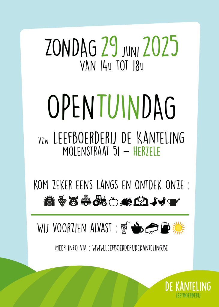 20 juni 2025zondag 29 juni jaarlijkse opentuindag 14u tot 18u. Leefboerderij De Kanteling Molenstraat 51 Herzele en... Officiële opening bufferbekken nabij De…