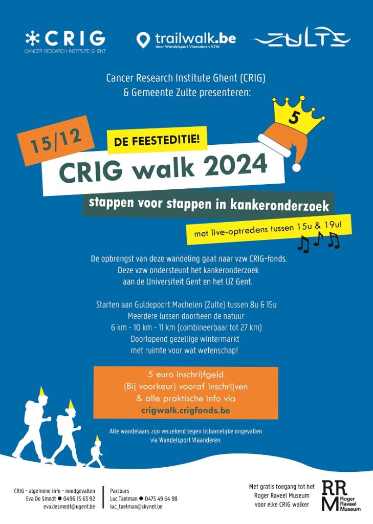- Crig Walk 20243 december 2024Wandel mee en steun het Gentse kankeronderzoek! zondag 15 december 2024 Guldepoort Dorpsstraat 46, 9870 Machelen (Zulte) starten mogelijk tussen…
