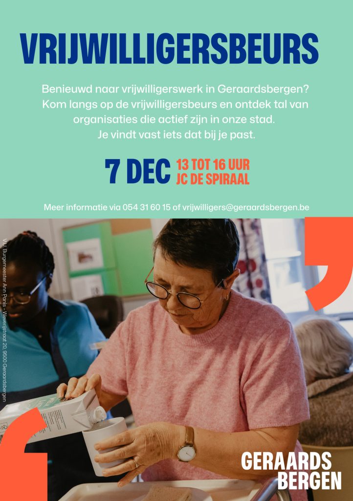 - Vrijwilligersbeurs Geraardsbergen5 december 2024ontdek de kracht van vrijwilligerswerk Op zaterdag 7 december 2024 organiseert het lokaal bestuur van Geraardsbergen opnieuw een vrijwilligersbeurs, van…
