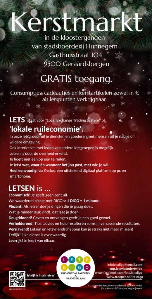 - Kerstmarkt26 november 2024Kom je naar onze eerste Lets DIGO-kerstmarkt? zondag 1 december 2024 13-17 u Hunnegem Gasthuisstraat 104 Geraardsbergen Uitgebreid aanbod met…