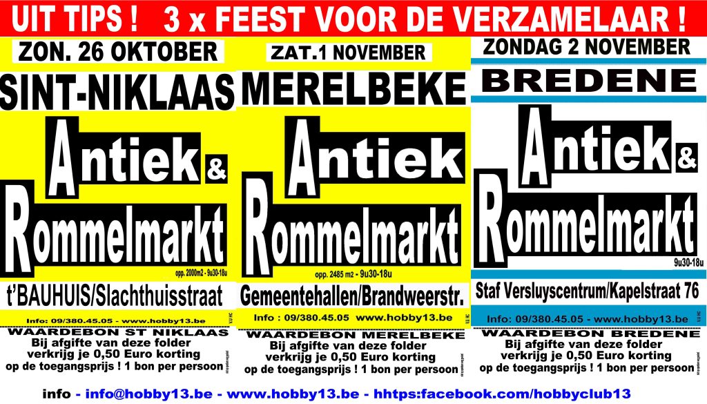 27 oktober 2025Zondag 2 november 2025 - 09:30 tot 18:00 BREDENE (8450) Staf Versluys Centrum/Kapelstraat 76 Ontdek meer data via www.hobby13.be