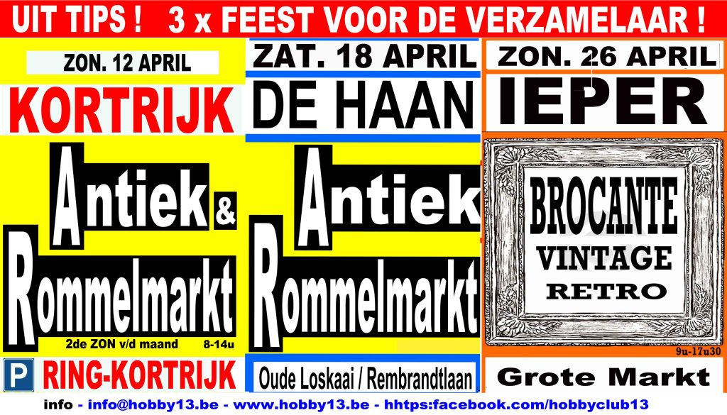 7 april 2026Zondag 26 april IEPER 8900 Grote Markt 09:00 tot 17:30 Ontdek meer data via www.hobby13.be