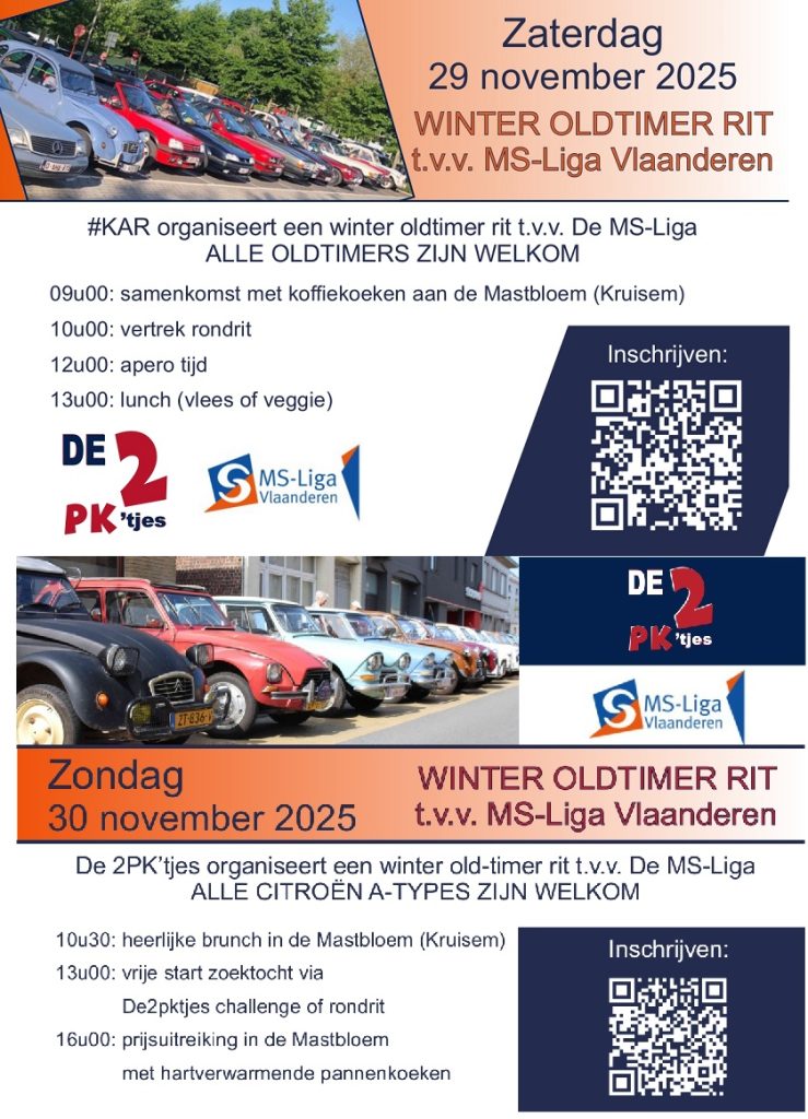 14 november 2025Zaterdag 29 november – Oldtimerrit voor alle merken (min. 30 jaar oud) Een gezellige bolletje-pijltje rit van ± 60 km,…