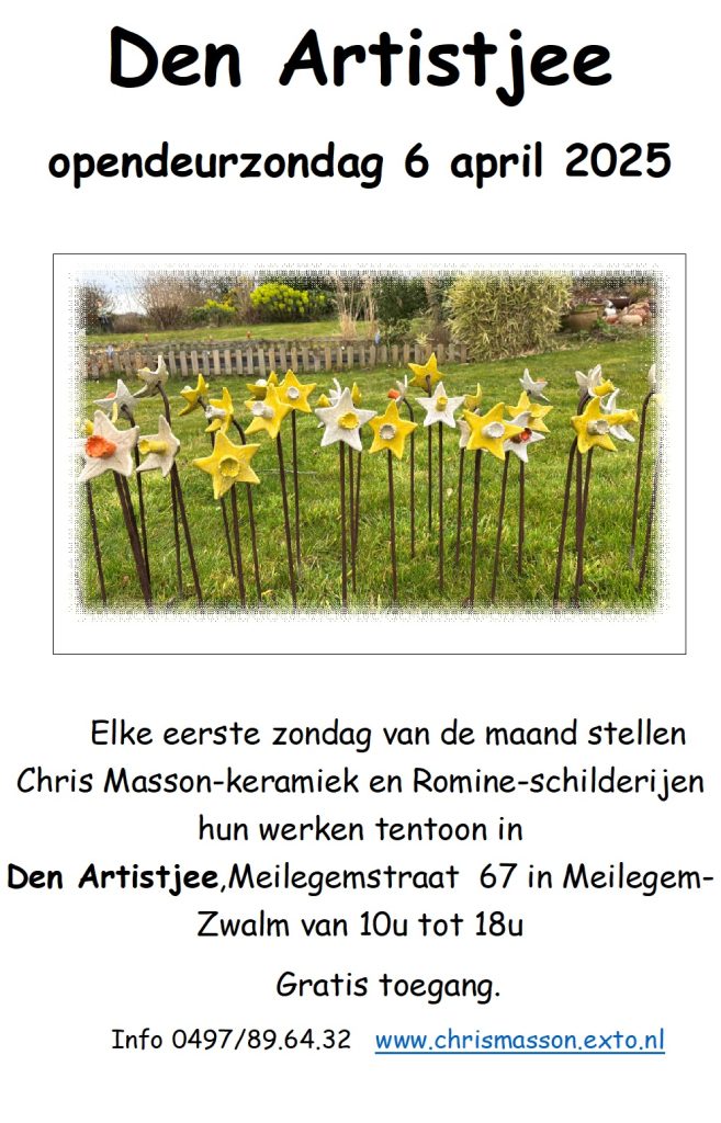 28 maart 2025Opendeurzondag 6 april 2025 in Den Artistjee keramiek Chris Masson en schilderijen Romine open van 10u tot 18u...ook het atelier…