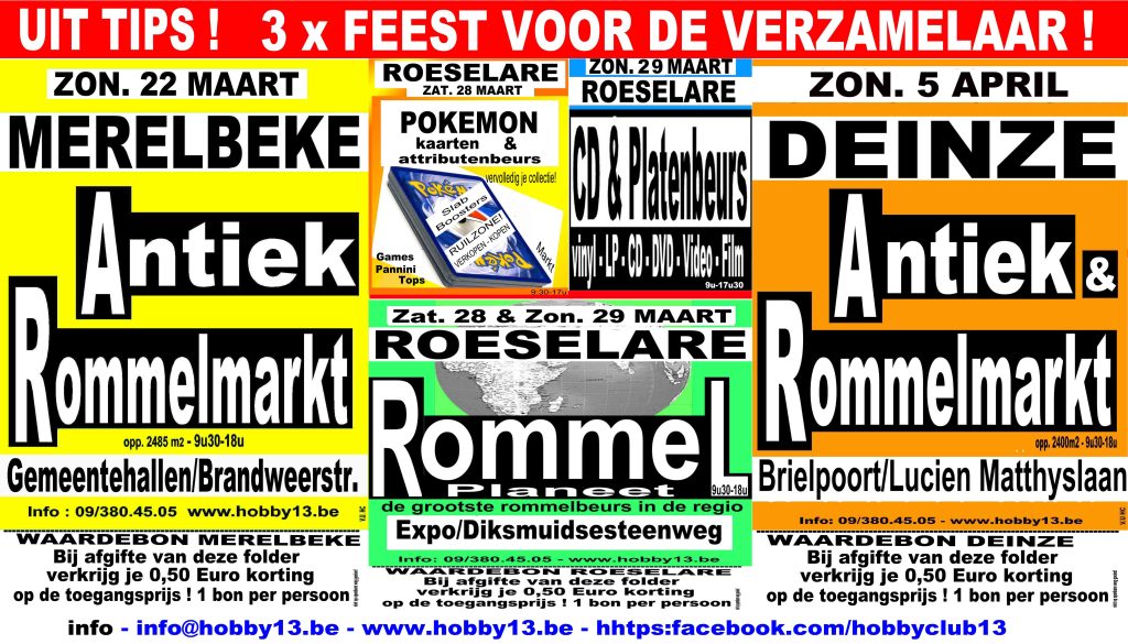 23 maart 2026Zondag 5 april 2026 - 09:30 tot 18:00DEINZE (9800) Brielpoort/Lucien Matthyslaan 9 Antiek & Rommelmarkt Zondag 28 maart 2026 ROESELARE…