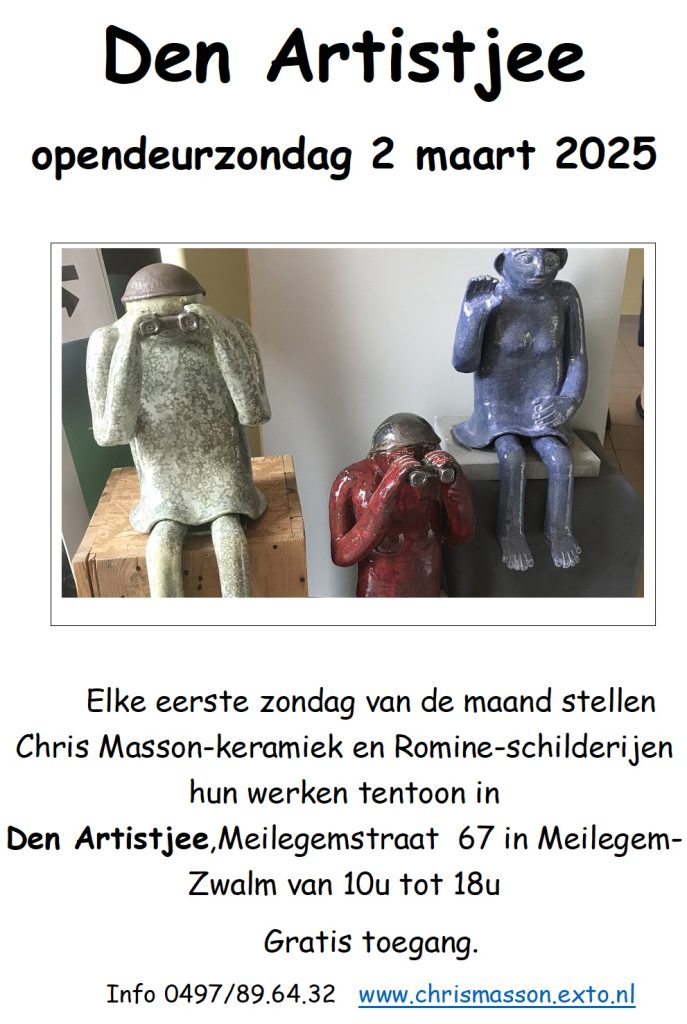 24 februari 2025op zondag 2 maart 2025 van 10u tot 18u Meilegemstraat,67 in Meilegem-Zwalm keramiek Chris Masson en schilderijen van Romine 300m²…