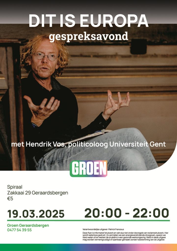 17 februari 2025Hendrik Vos Politicoloog Dit is Europa - De geschiedenis van een unie woensdag 19 maart 20:00 - 22:00 Spiraal Zakkaai…