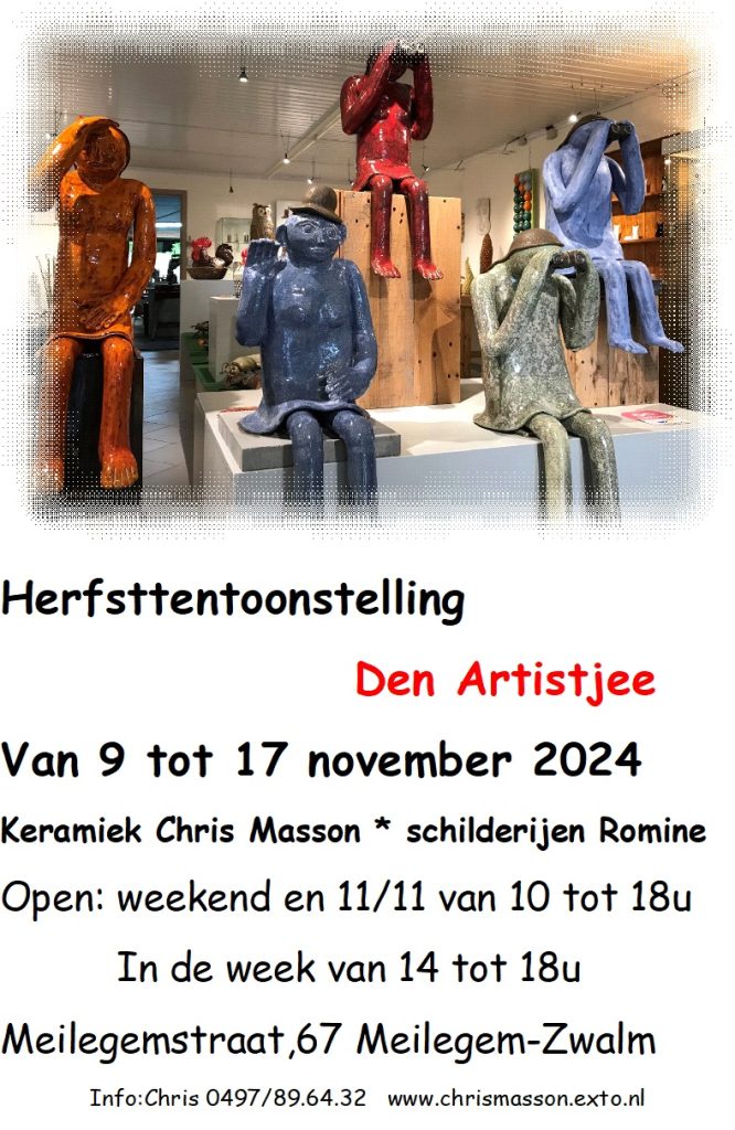 22 oktober 2024Herfsttentoonstelling Den Artistjee van 9 tot 17 november 2024 open tijdens het weekend en op 11/11 van 10u tot 18u…