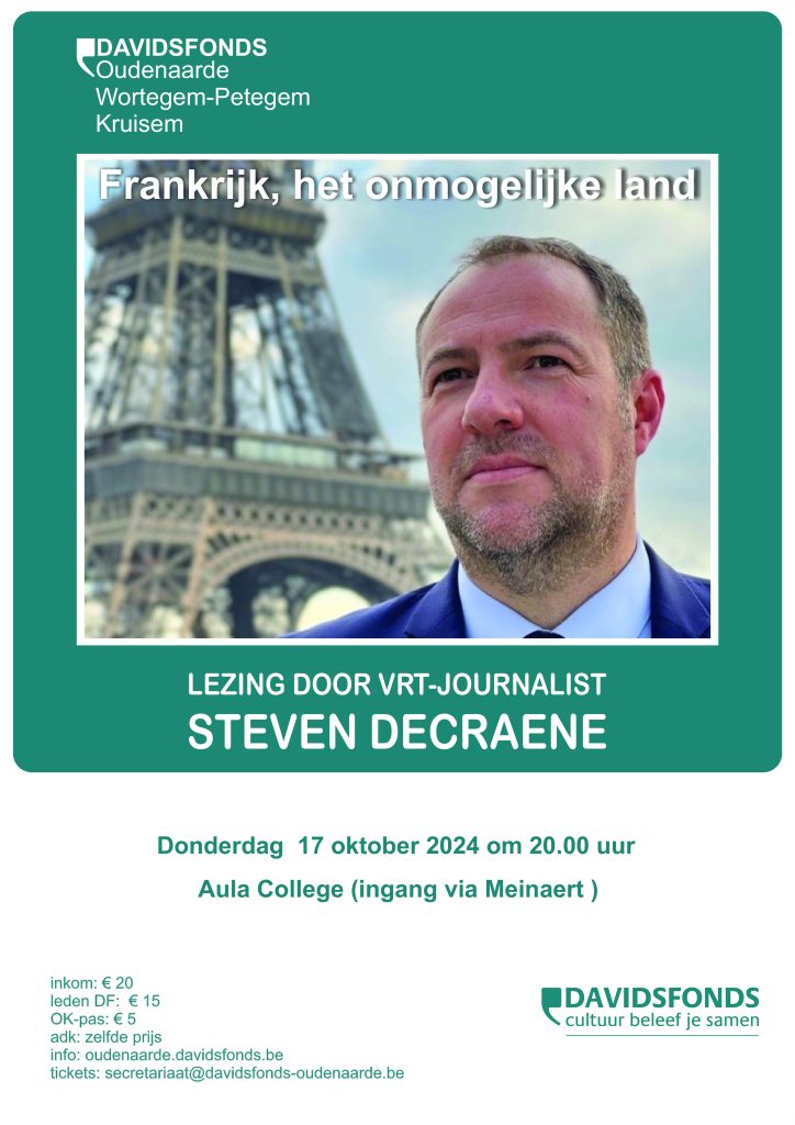 23 september 2024LEZING DOOR VRT-JOURNALIST STEVEN DECRAENE Donderdag 17 oktober 2024 om 20.00 uur Aula College (ingang via Meinaert ) Oudenaarde inkom:…