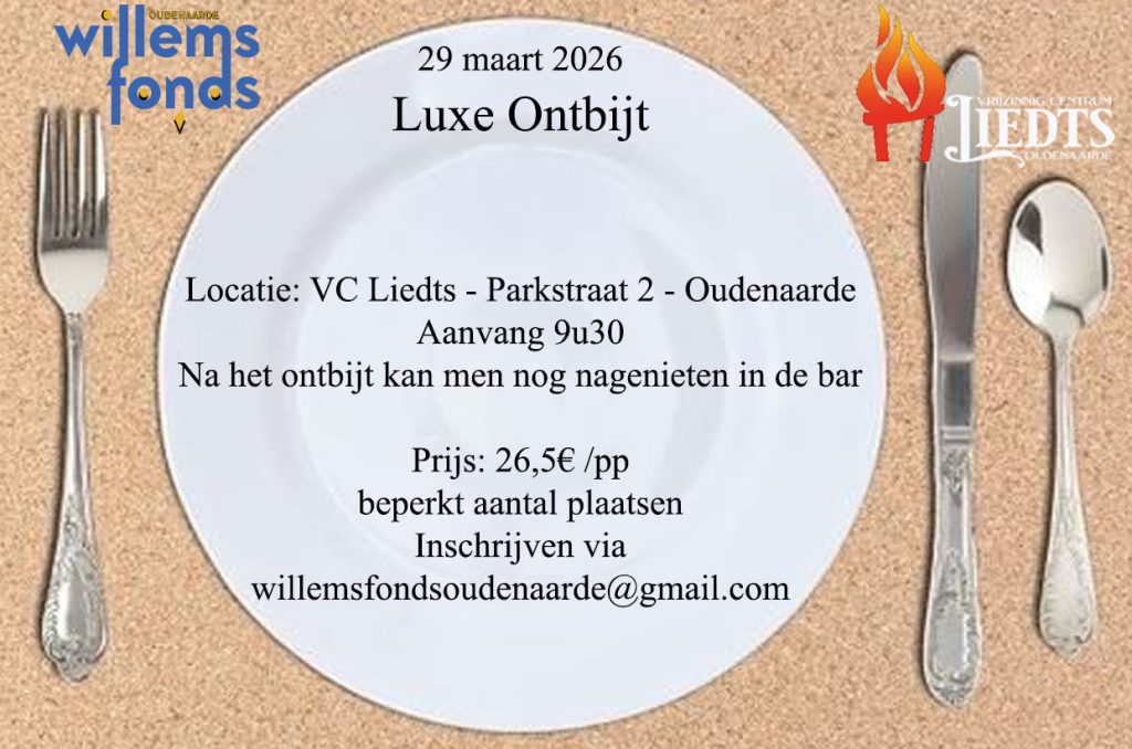 3 februari 2026Willemsfonds Oudenaarde richt in: Luxe ontbijtzondag 29 mrt 2026, 09:30 – 14:00Parkstraat 2, 9700 Oudenaardeinschrijven : willemsfondsoudenaarde@gmail.com