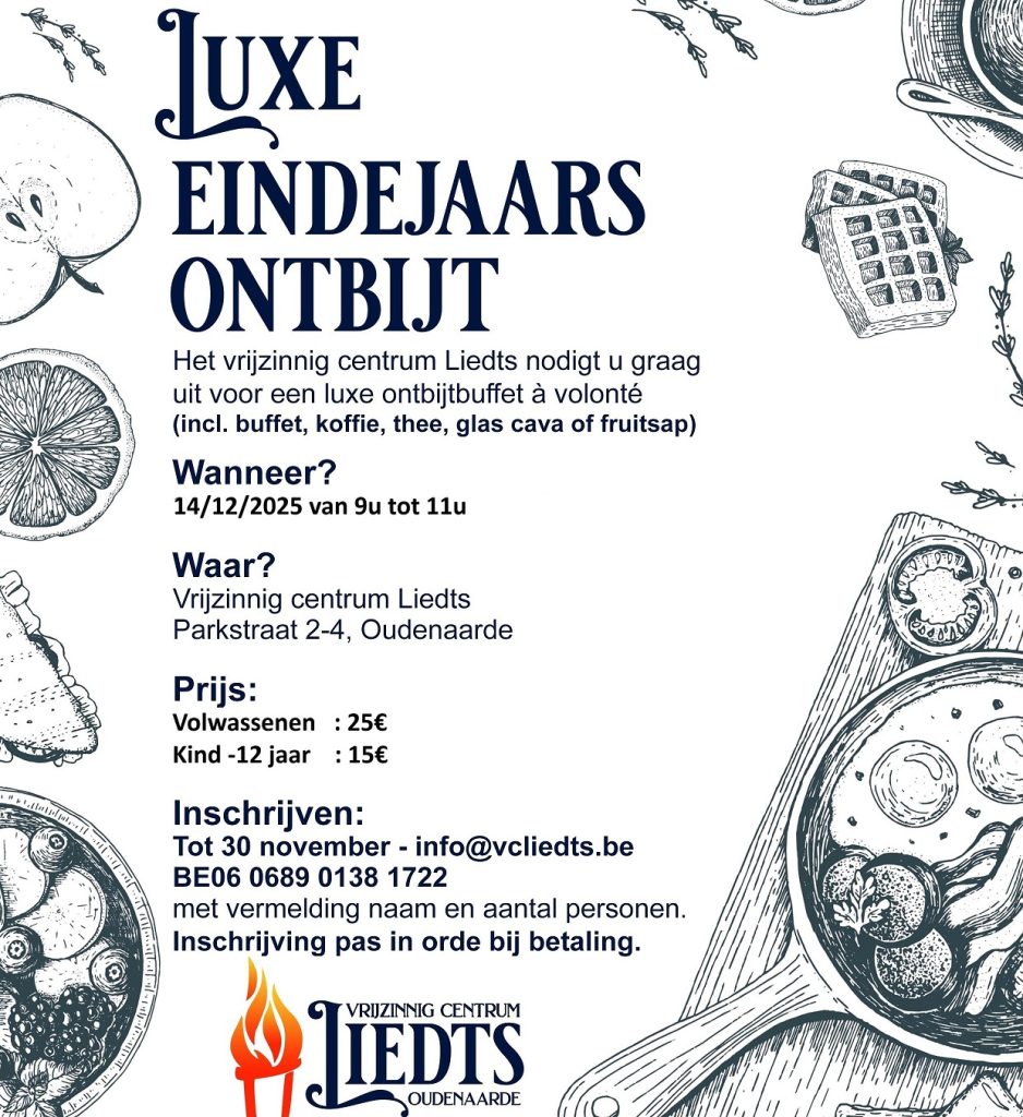 29 augustus 2025Vrijzinnig Centrum Liedts nodigt uit: Zondag 14/12/2025 van 9u tot 11u Vrijzinnig Centrum Liedts Parkstraat 2-4 Oudenaarde Volwassenen- 25€ Kinderen (tot 12j)-…