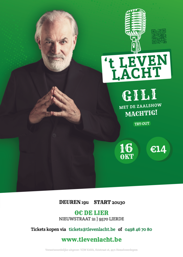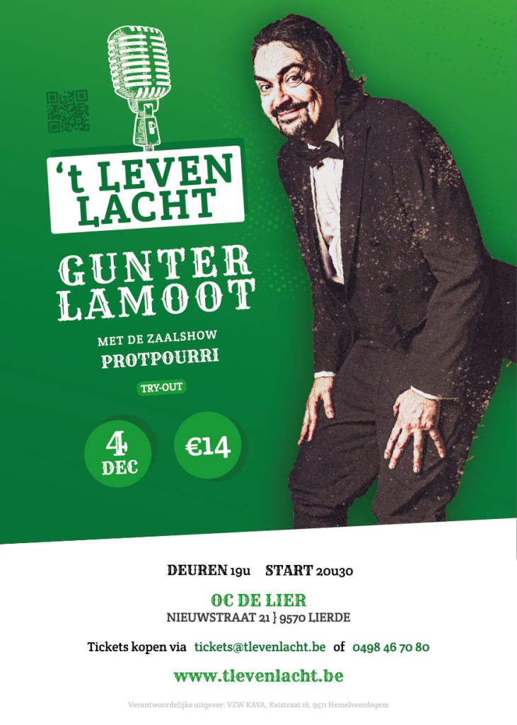 7 april 2026Protpourri vrijdag 4 december 2026 – 20u30OC De Lier Nieuwstraat 21 Lierdetickets 14 € tickets@tlevenlacht.be of 0498 467080Gunter Lamoots zevende liveshow is er…