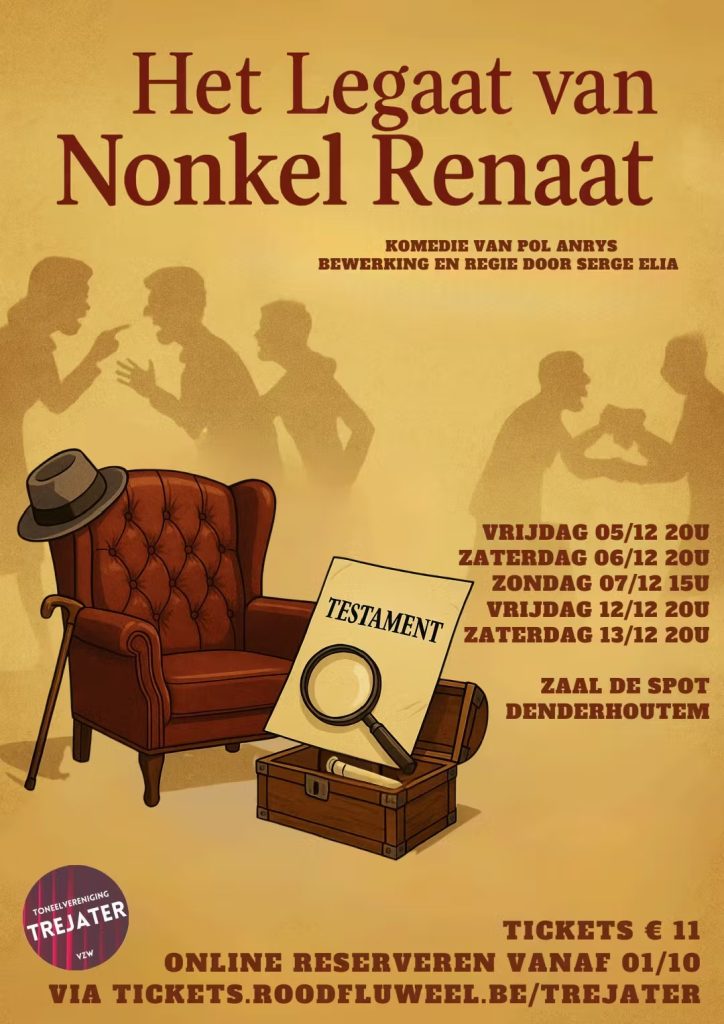 20 november 2025Het legaat van nonkel Renaat vr 5 december 2025van 20:00 tot 22:30 za 6 december 2025van 20:00 tot 22:30 zo 7 december 2025van 15:00 tot 17:30 vr 12 december 2025van 20:00 tot 22:30 zo 14 december 2025van 15:00 tot 17:30…