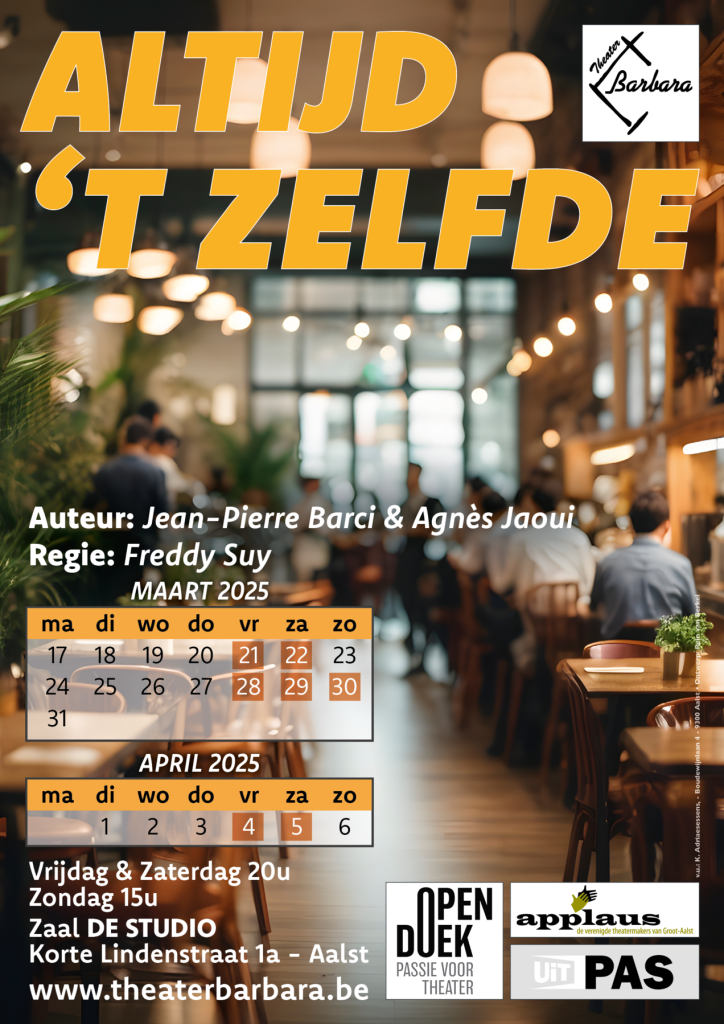 2 januari 2025Altijd 't zelfde vrijdag 21 maart 2025 om 20u zaterdag 22 maart 2025 om 20u vrijdag 28 maart 2025 om…